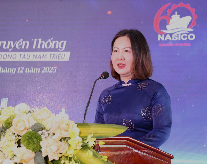 Bà Trịnh Thị Thu Thuỷ - Bí thư Đảng ủy, Chủ tịch Công ty Đóng tàu Nam Triệu trình bày diễn văn chào mừng tại buổi lễ