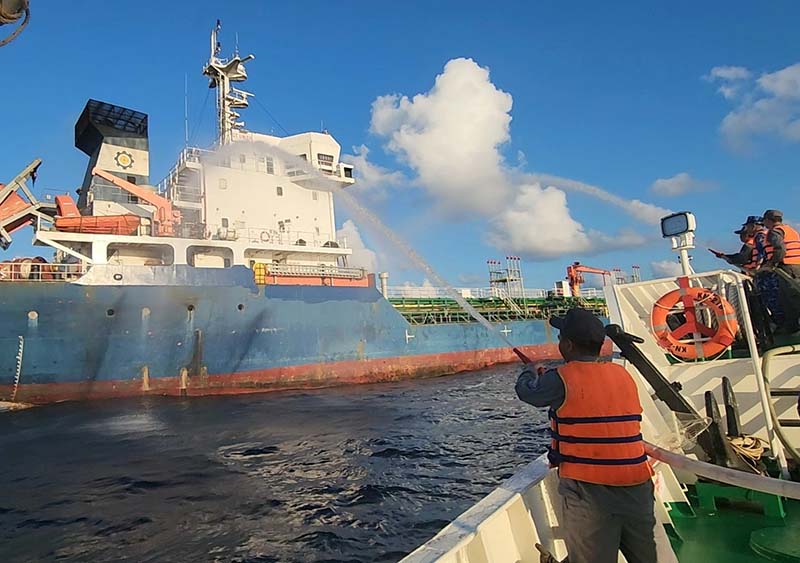 Lực lượng làm nhiệm vụ trên tàu KN 210 đang phun nước chữa cháy tàu GT UNITY